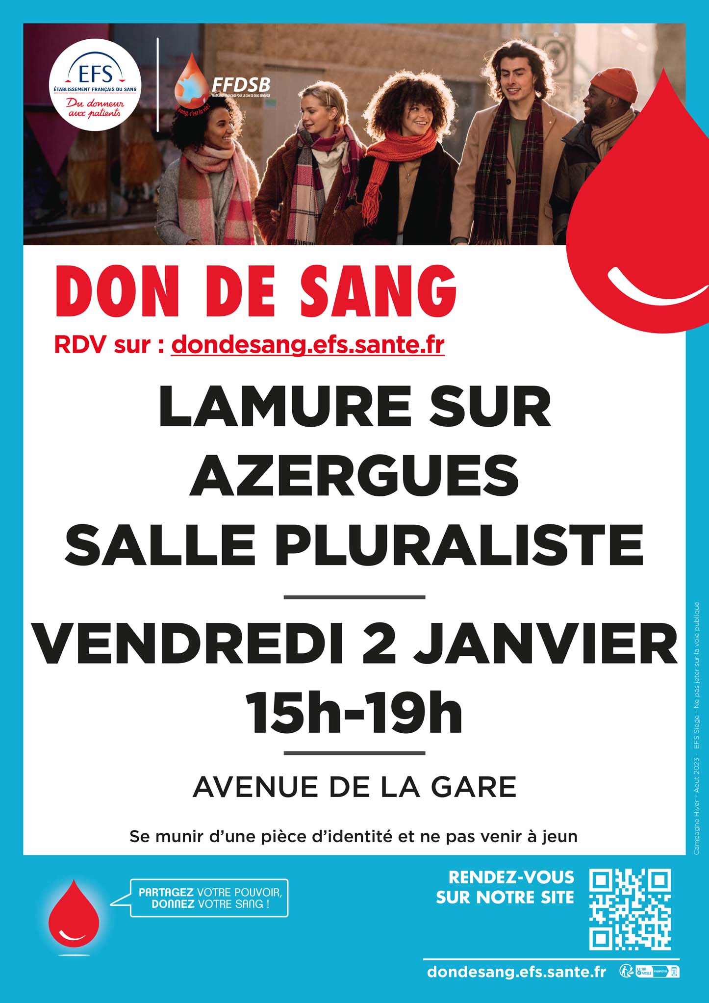 ➡ collecte de sang prévue à LAMURE SUR AZERGUES le LUNDI 11 AOUT 2024 à la SALLE PLURALISTE de 15h à 19h, AVENUE DE LA GARE 69870 LAMURE SUR AZERGUES